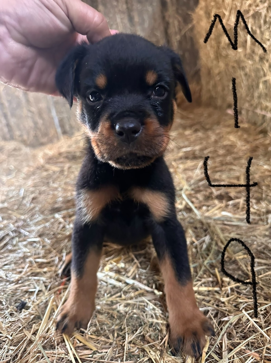 In the photos of this litter, each puppy is marked with a letter and a 3-digit number. M stands for Male, F stands for Female, and the number is the last 3 digits of their microchip number.